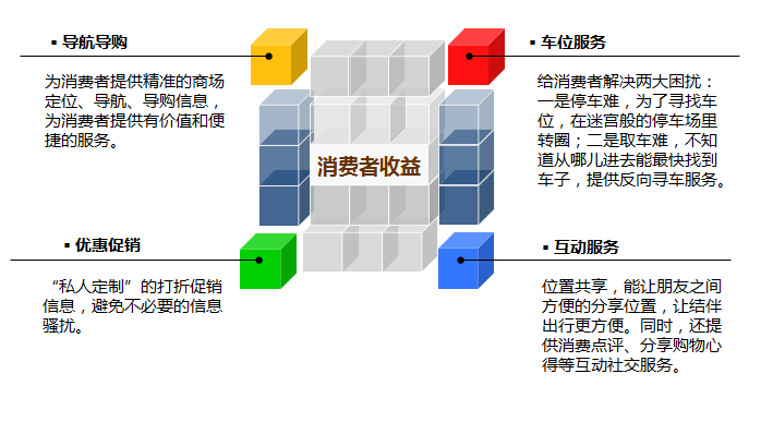 商家方面,通过信息分析,发送促销消息给潜在的客户群体,了解来店客户的喜好,促进消费,店铺定位,让来到商场的消费者快速的找到自己想要的店铺。