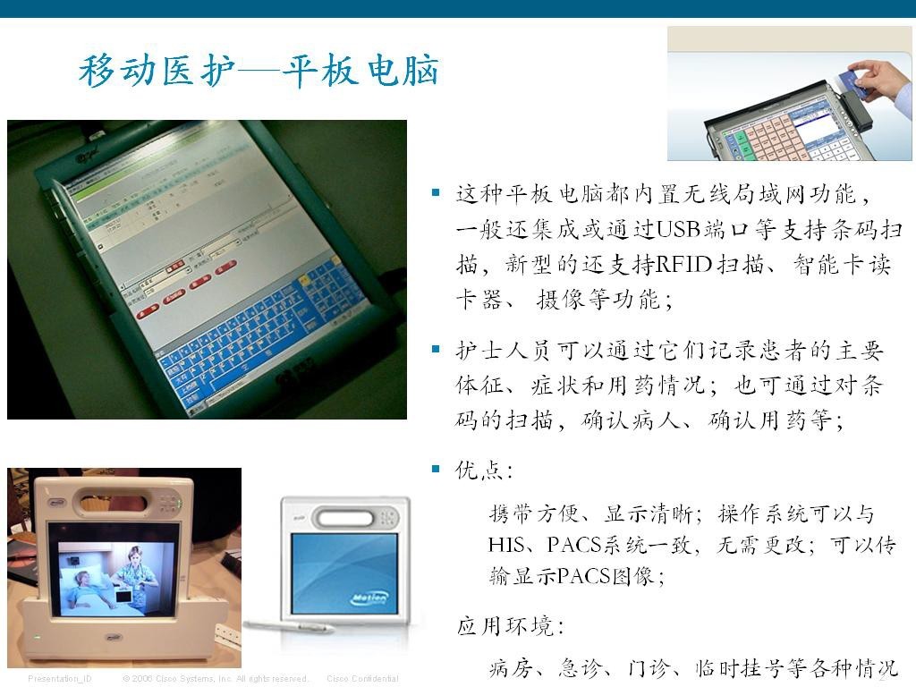 在病房、急诊、输液等环境,移动医护可用于病人身份确认、病人生命体征的采集、病症纪录、用药的对比等。使医嘱和护理任务更加规范合理。目前应用最多就是移动医生工作站、移动护士工作站、RFID标签等。无线终端可以是移动手推车、平板电脑、PDA。有的终端还配有条码扫描、RFID扫描、智能卡读卡器、摄像头等功能,通过对条码的扫描确认病人和用药情况,还可以实时收集患者的主要体征和症状。