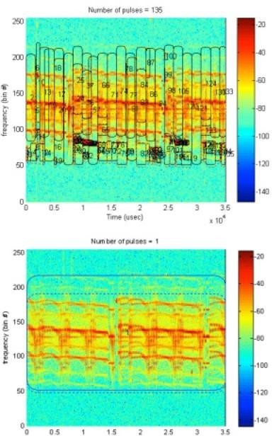 以下以图形方式显示识别能量脉冲的 SAgE。第一个图像显示来自硬件脉冲检测器块的数据,第二个图像显示软件组合了多个脉冲之后的数据,这些脉冲极为匹配,以致可认为是单个脉冲
