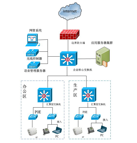 本方案选用核心10GE万兆以太网络技术,同时选用了企业级最高端的路由交换机,并对企业网络进行优化设计,使用区网络系统具备丰富的网络系统功能,为企业生产业务系统的稳定运行奠定了坚实的基础。在办公区域添加了无线AP设备做到对办公区的无线覆盖,达到了可移动办公的要求。