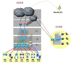 思科的解决方案提供了集安全性、无线接入和统一通信于一体高智能网络。其特点是充分利用网络设备,通过模块化的增强和设备软件多功能的开启,同时配置IP电话和无线接入点AP,实现一个安全的多功能业务支撑网络。此外,思科特别增加了广域网接入和广域网链路优化的设计。